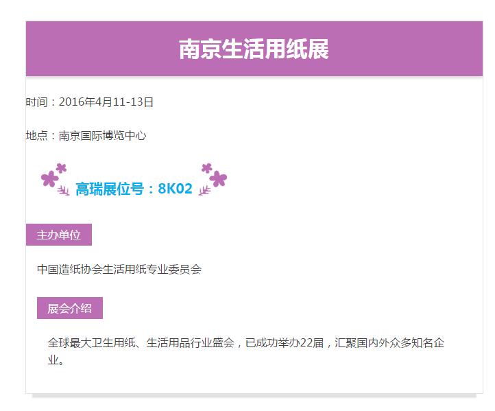 CIDPEX2016南京生活用紙年會即將于4月11日盛大啟幕。高瑞將攜2016年升級版紙巾機械專用機隆重參展,專業技術人員現場為您提供解決方案。